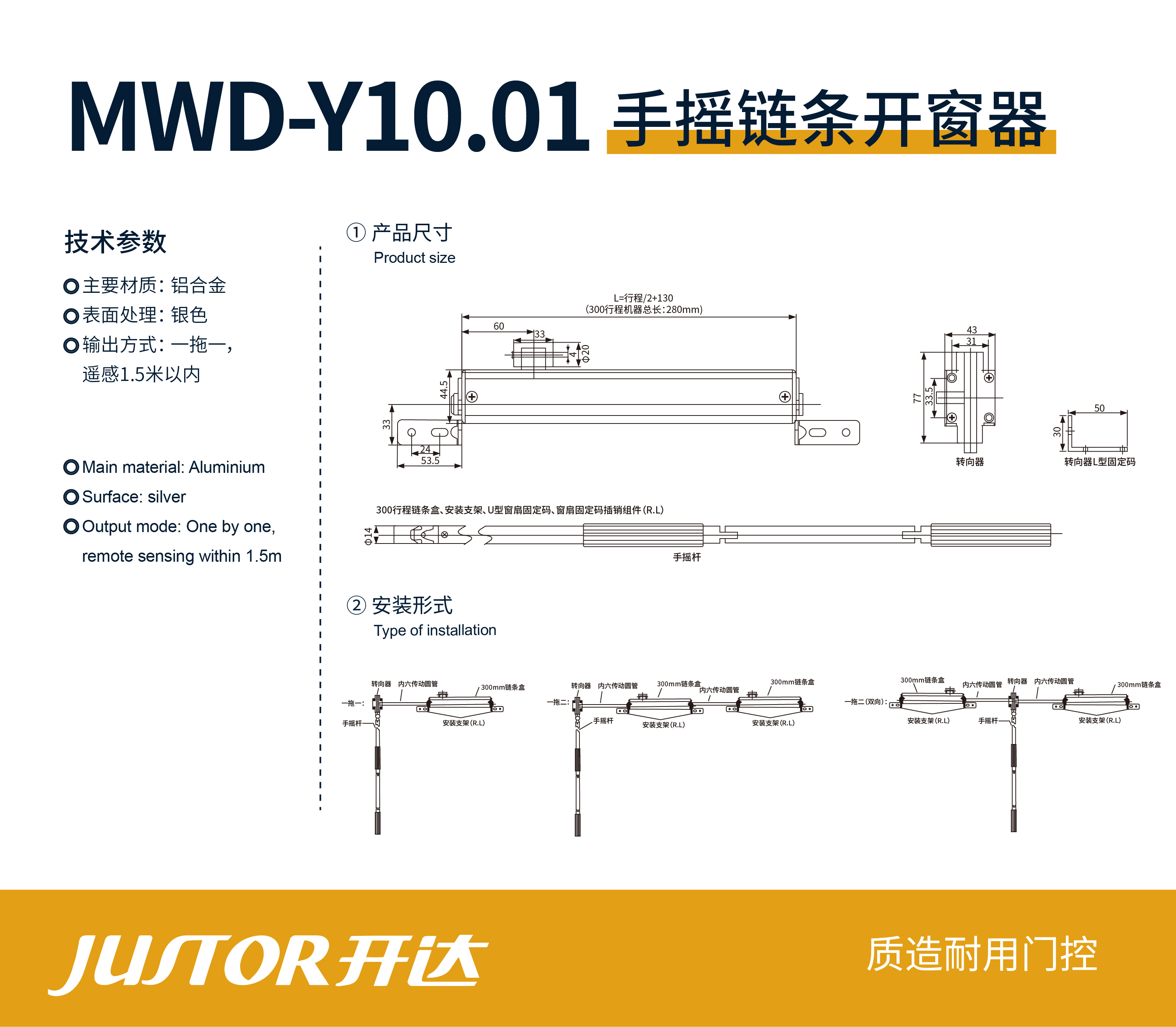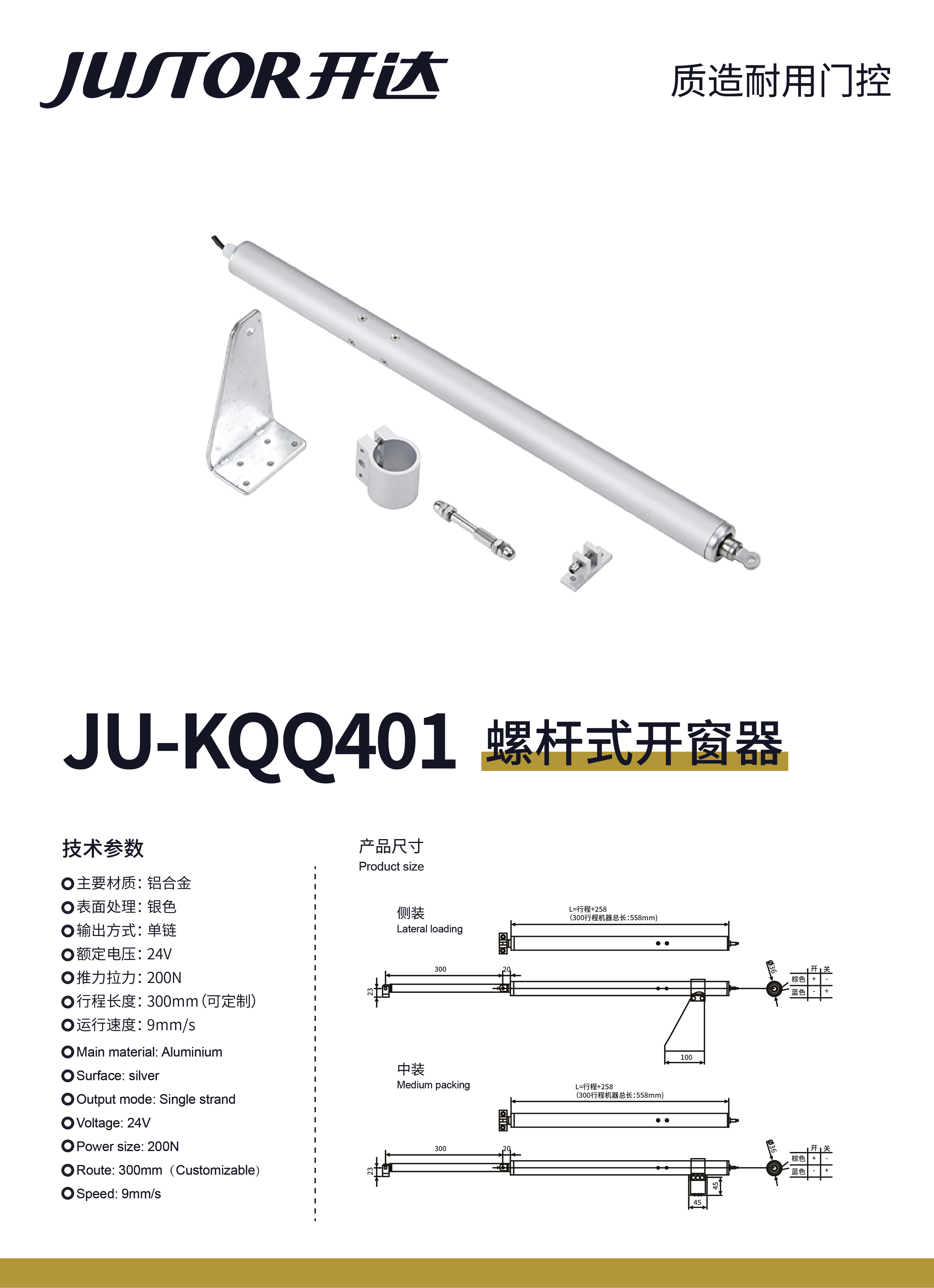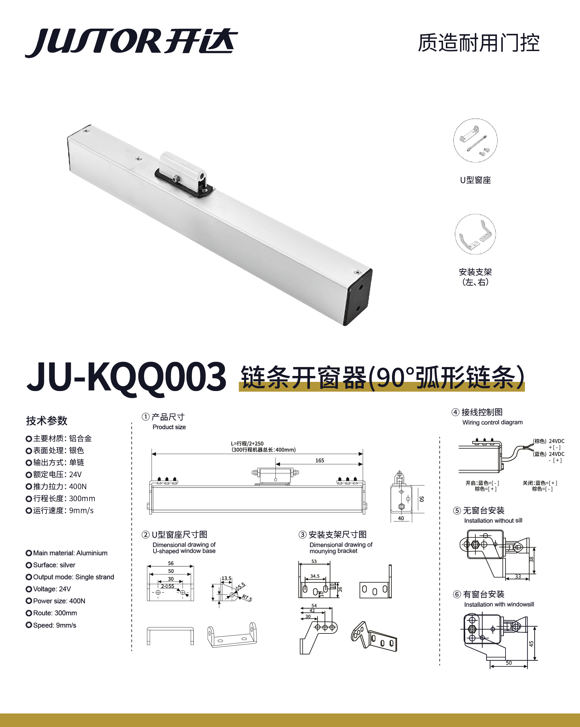 链条电动开窗器,是由一个电机、一根传动轴和一条链轮组成。当窗户打开时,通过电机转动带动传动轴旋转,使链条在链轮内做往复的直线运动,从而实现对窗户的开合控制。由于它的工作方式是连续不断的往返运动,因此具有结构简单、操作方便、安全可靠等优点。